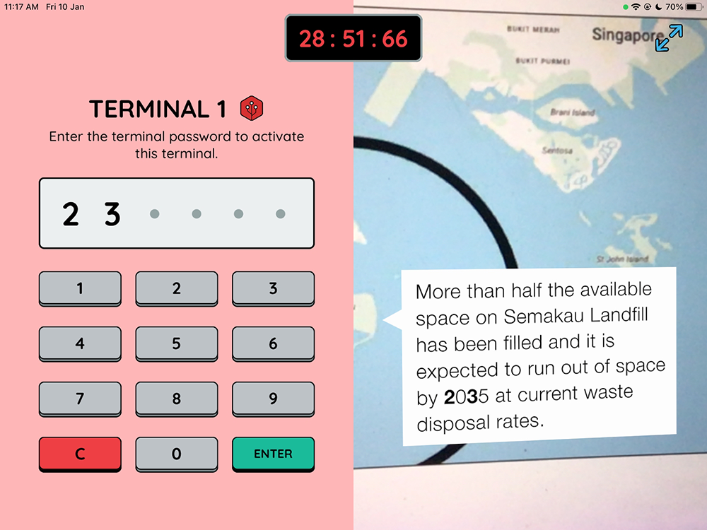 Smart Sustainable Workshop develops sustainability skills in secondary school students. This workshop allows students to explore real-world climate challenges and their impact on Singapore today. Through a simulated escape room combining augmented reality and collaborative group activities, they experience pressing issues such as pollution, biodiversity loss, greenhouse gases, and rising sea levels.